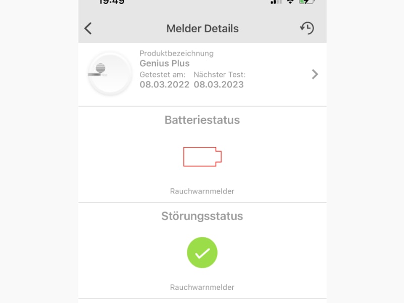 Der Hekatron Genius Plus ist mit einer Langzeitbatterie ausgestattet, welche das Gerät über dessen gesamte Lebensdauer (theoretisch 10 Jahre) mit Strom versorgt. Diese 3,6V Lithium Batterie mit einer Batteriekapazität von 2,2 Ah ist dabei fest in den Rauchmelder eingebaut und kann nicht ausgetauscht werden. Natürlich ist diese typische Batterielebensdauer von verschiedenen Faktoren abhängig. Dazu gehören z.B. die Anzahl der durchgeführten Funktionstests über die manuelle Testfunktion oder mittels App, oder die Dauer eventuell ausgelöster Alarme. Das Ende des Rauchmelder-Lebenszyklus ist auf der Unterseite des Melders angegeben (siehe Abbildung), kann aber auch über die Hekatron App abgefragt werden. Zudem wird der bevorstehende Austausch auch über die orange Status LED signalisiert. In unserem Langzeittest war die Batterie des Hekatron Genius Plus leider bereits nach 6 Jahren und 84 Tagen leer. Mit der letzten Energie konnte noch eine Abfrage mittels App gestartet werden, welche die Batterieerschöpfung bestätigte: